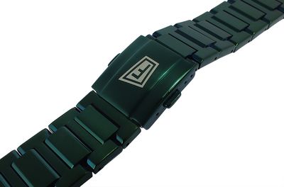 Verschluss: Faltschließe mit seitlichen Druckknöpfen, Edelstahl, grün, mit Logo