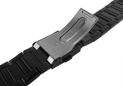 Verschluss: Faltschließe mit seitlichen Druckknöpfen, Edelstahl, schwarz, mit Logo
