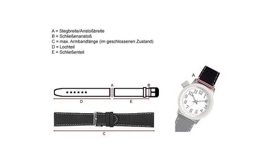 * Um den maximalen Umfang (Ersatzband + ihre Uhr) zu ermitteln, messen sie bitte die Höhe ihres Uhrengehäuses (von Steg zu Steg) und addieren dazu die max. Länge des Ersatzbandes (C). Messen sie nun ihr Handgelenk und vergleichen den max. Umfang mit ihrem Handgelenksumfang.